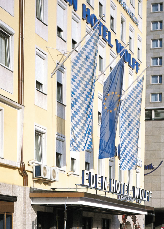 Konischer Fahnenmast mit innenliegender Hissvorrichtung für Schrägmontage an der Fassade. Bedienung vom Boden aus.