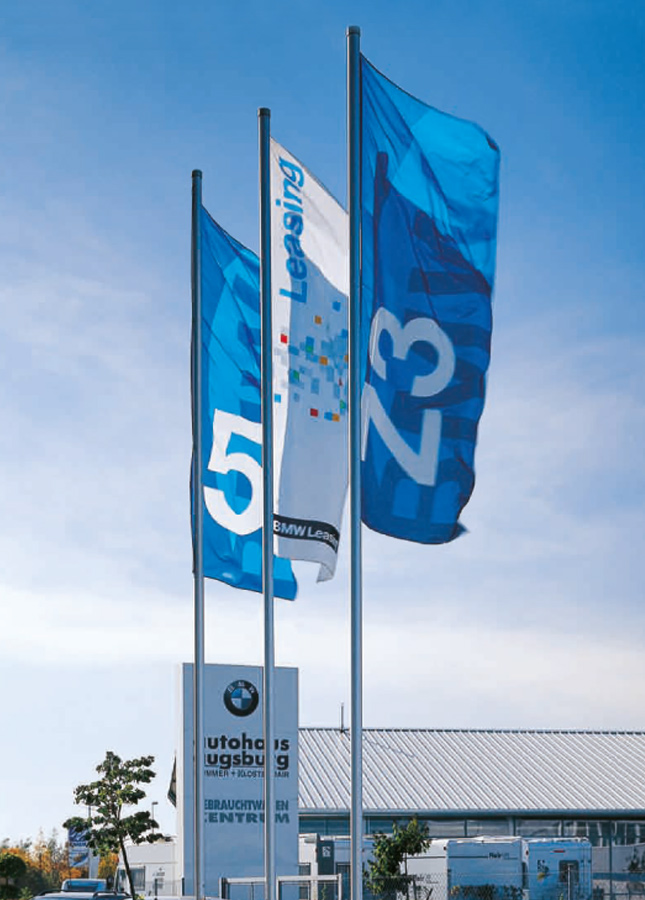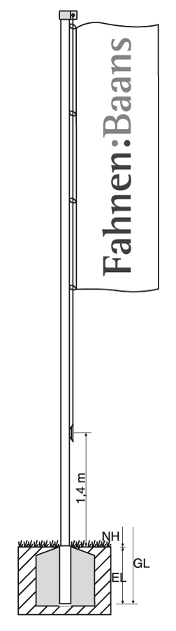 Eine besondere Fahnenkonfektion ist nicht erforderlich. Es können alle gängigen, frei auswehenden Fahnenarten bis zur maximalen Größe von 1,50 x 4,00 m (bis zur NH 8,00 mm) und 1,50 x 5,00 m (bei den NH 9,00 und 10,00 m) gehisst werden. Der oberste Fahnenkarabiner wird in die Kauschenpressung des Hissseiles eingehakt, die unteren Karabiner um das Hissseil.